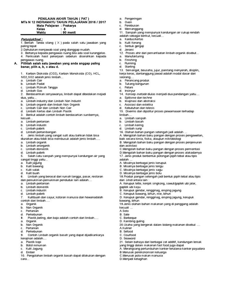 Soal pat/ukk prakarya kelas 7 dan kelas 8 ini bisa dijadikan bahan referensi dalam membuat soal penilaian/ujian lengkapi.